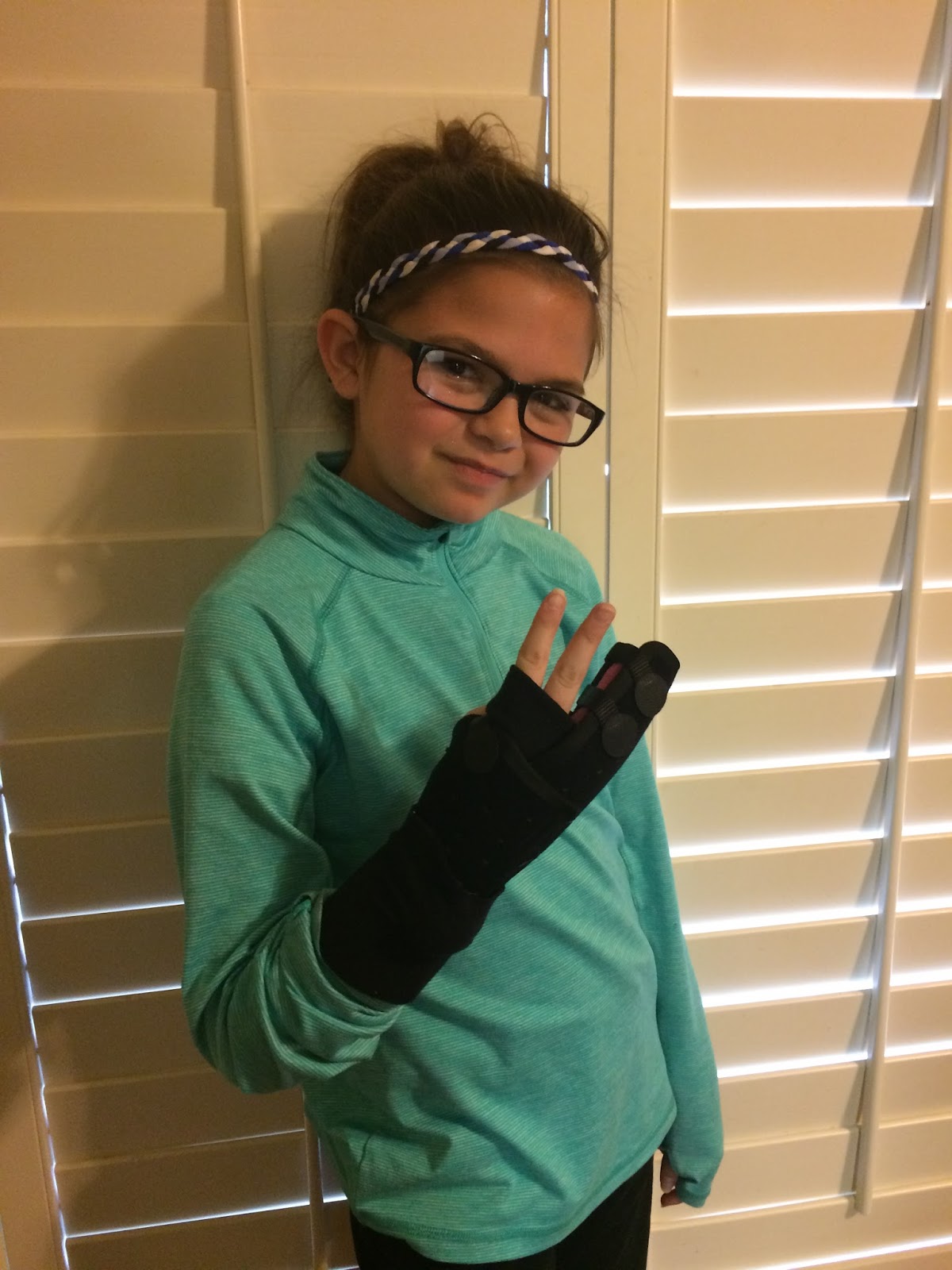 Allison came home from PE complaining about pain in her hand specifically her pinky finger. During PE they were playing some kind of dodgeball bowling game.. She reached out to stop the ball and her hand bent backwards. Allison can over exaggerate on injuries. We iced it down and gave Motrin. The next morning she complained but that was expected. It was the next day I became concerned when the swelling had not gone down. I called the pediatrician who said it sounded sprained but to give it over the weekend if not better than to come in. On Friday Allison was still complaining so Richard and I decided I should take her into the urgent care. After a quick exam and X-rays the Doctor said it was broken. They referred us to a specialist and put her finger in a splint. We made it through the weekend to her appointment Monday with the orthopedic specialist. They put it in a brace type thing. It has a hard case inside of it. She can only take it off to shower. We went back fir xrays and the break hasn't shifted but her finger is not healing as fast as it should. Whick means she could be in it longer than the projected 4 weeks.